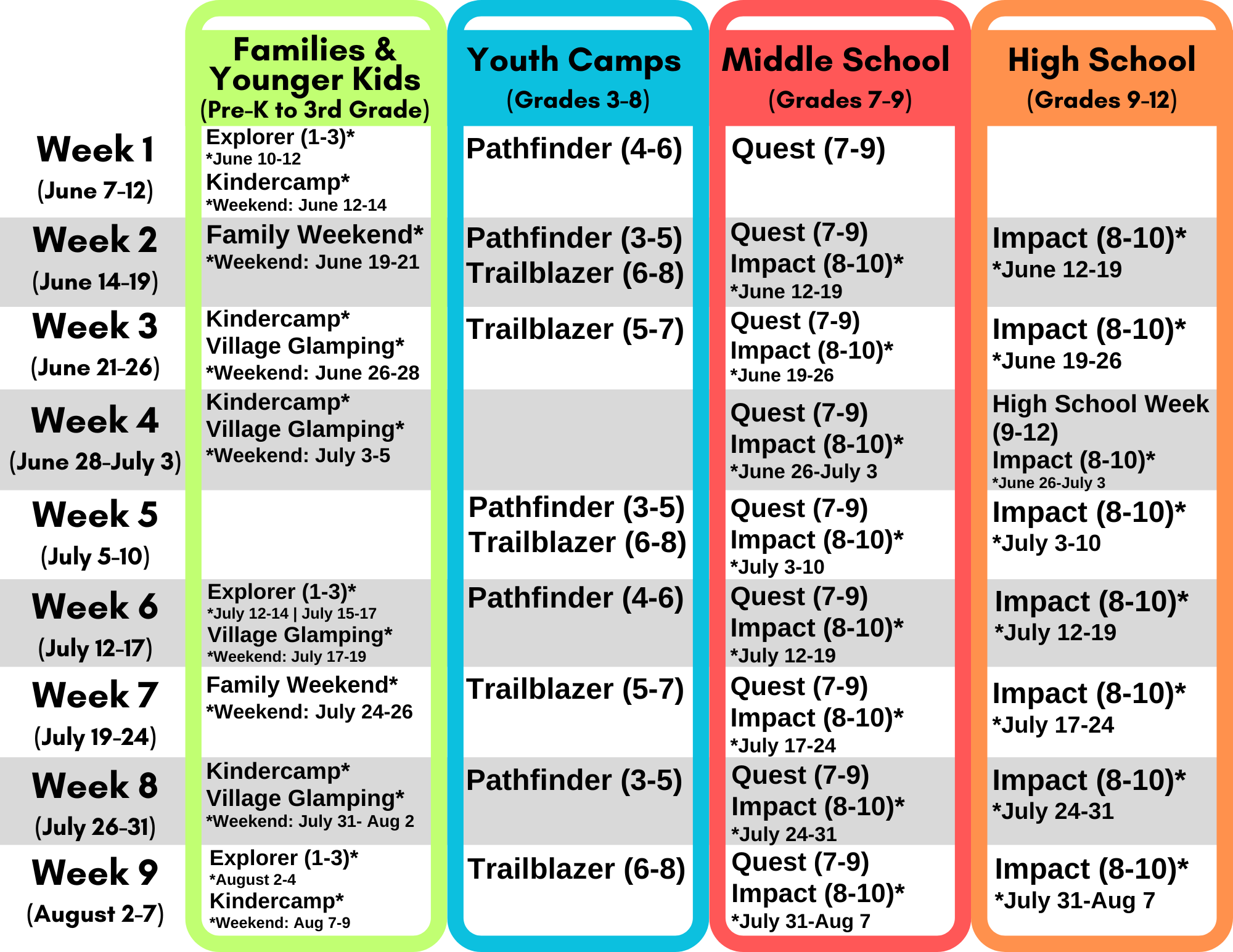 *All grade levels are based on current grade levels for the 2025-2026 school year. For the well being of the program, campers, and staff, we do not make exceptions for camper grade.*