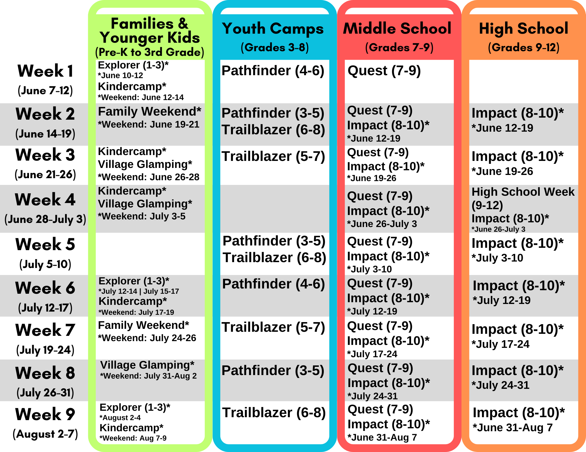 Our complete youth camp summer packing list. IMPACT and High School week may receive additional packing suggestions closer to their session dates.
